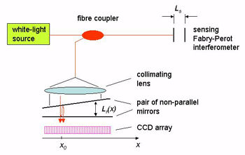 例如,干涉儀由兩個非平行的鏡子組成,以透射方式工作??梢钥闯?,氣隙Lr(x)取決于沿鏡子的位置x,并且在位置x0處產生最大干涉信號,其中Lr(x0)與傳感干涉儀的間隙Ls精確匹配。該位置x0很容易由安裝在鏡子后面的CCD陣列確定。