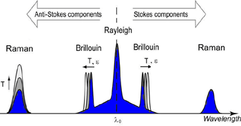 發現瑞利散射分量與入射光具有相同的波長l 0。有兩個拉曼分量偏移相同的量(斯托克斯分量)和低于l0(反斯托克斯組件)。類似地,布里淵背向散射由兩個在低于和高于l 0的