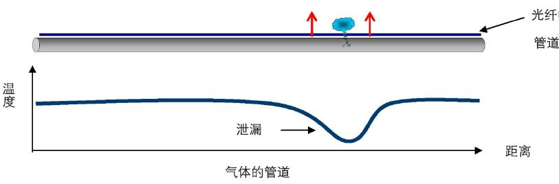 油氣管道泄漏時(shí)會(huì)引起泄漏點(diǎn)周圍溫度的變化,通過分布式光纖溫度傳感系統(tǒng)可以準(zhǔn)確定位泄漏點(diǎn)。在天然氣管線介質(zhì)泄漏受壓情況下,氣態(tài)物質(zhì)導(dǎo)致的泄漏點(diǎn)的低溫,是由物質(zhì)的物理性質(zhì)、工藝條件和周圍環(huán)境所決定的。這些點(diǎn)的溫度異常可通過分布式溫度測量而獲得,并有很好的溫度、距離和反應(yīng)時(shí)間精度。管道本身發(fā)生泄漏事故時(shí),泄漏出的天然氣由于存在壓力,會(huì)向管道周圍發(fā)出噴射狀的氣體。如果能對(duì)整條天然氣管道在現(xiàn)有的壓力、流量探測技術(shù)基礎(chǔ)上,利用沿管道敷設(shè)的通訊光纜,接入分布式光纖測溫傳感主機(jī),就能夠?qū)崟r(shí)探測到泄漏點(diǎn),并進(jìn)行泄漏點(diǎn)的定位和報(bào)警顯示。