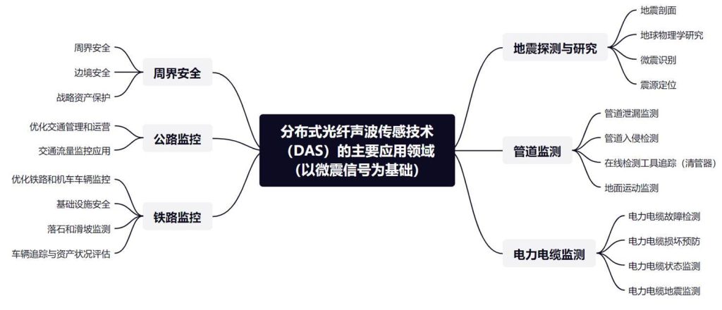 基于光纖的分布式聲波傳感器(DAS)是一種利用光纖中的后向瑞利散射(RBS)來定位和恢復光纖鏈路上的任意位置處機械振動信息(振幅、相位和頻率)的技術 。由于機械振動通常能夠在介質(zhì)中傳播很遠,DAS 能夠檢測遠離光纖的事件;基于光纖的低損耗特性,傳感光纖的長度可達數(shù)千米至上百千米,因此 DAS 系統(tǒng)的探測覆蓋范圍非常廣;DAS 的振動檢測帶寬可高達數(shù)十千赫茲,可以包含待測事件的豐富信息 ;傳感光纜具有本征安全、抗電磁干擾、耐惡劣環(huán)境等優(yōu)勢。這些優(yōu)點使得 DAS 在周界圍欄安防、管道安全監(jiān)測、井下資源勘探等長距離應用領域中有著巨大的應用潛力,并且其應用領域仍在不斷拓展中。